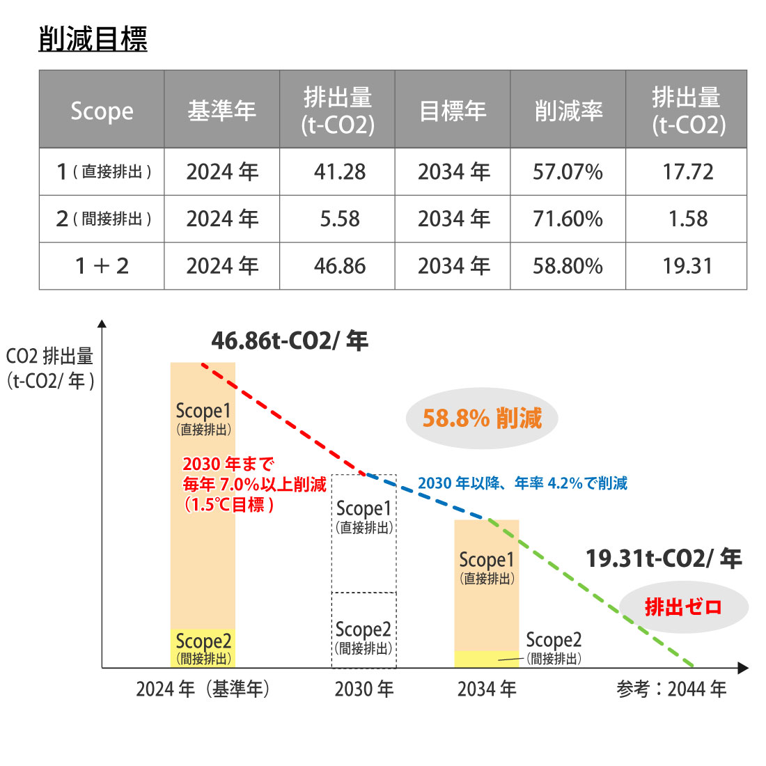 Scope1とScope2のGHG排出量を2024年の基準年から2034年までに58.8%削減し、将来的にはScope3(Scope1、Scope2以外の間接排出)の排出量を測定して削減する。